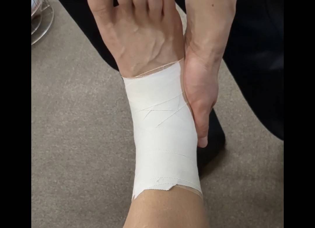 ・キネシオテープ:外くるぶし下(前距腓靱帯部分)のテープを前方に引っ張りテープを「くの字」にしテンションをかける